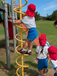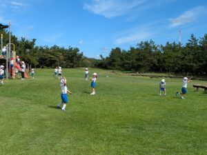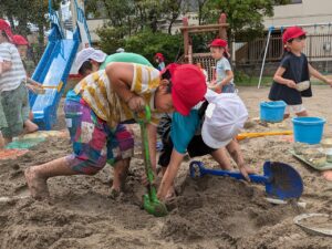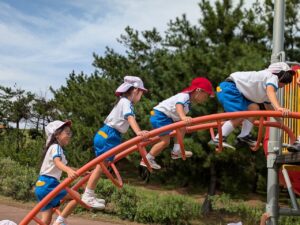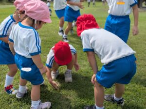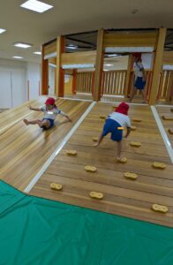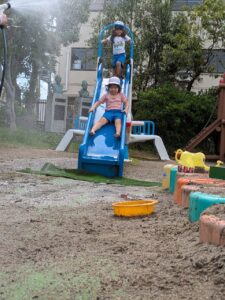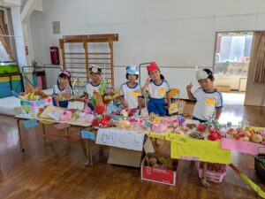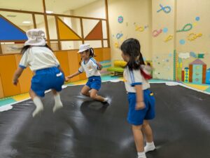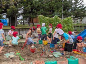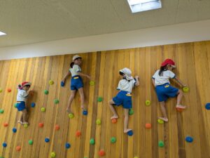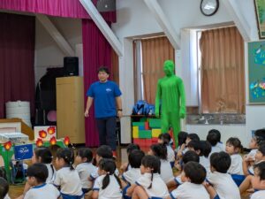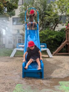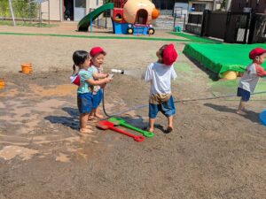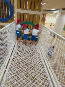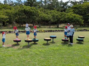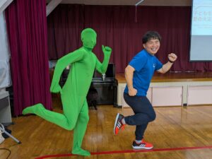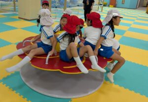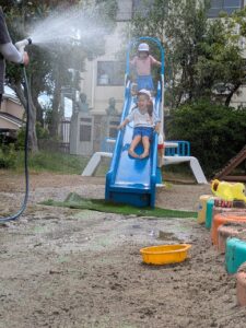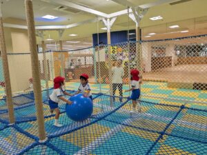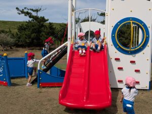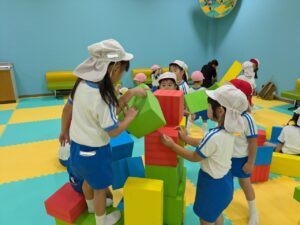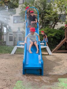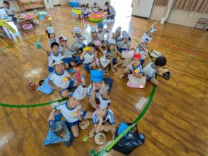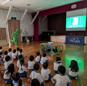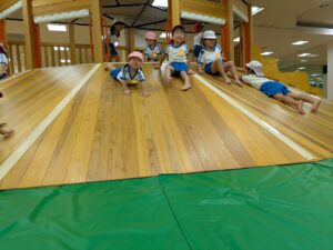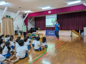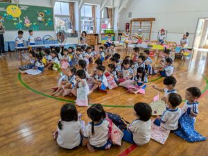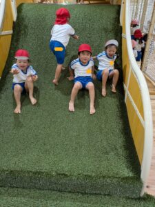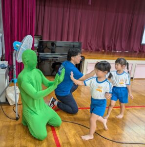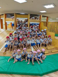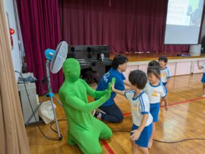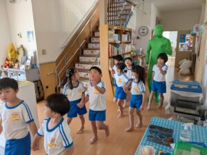 現役消防士さんたちによる『ONE LOVE』の方に来ていただき、火災予防教室をしていただきました。もし、火事にあって消防士さんが間に合わなかった時、自分の命を守るためにどうしたらよいかを具体的に教えてもらいました。お出かけ先では、非常口の『にげろマーク(誘導灯)』を見つけること。お店などにあるにげろマークを確認しておくことは非常時にとても大事なんだって!にげろマークのミドリマンも現れて、一緒に話を聞いたり園内のにげろマークを探したりしてくれました。おかげで、今までなんとなくしか気づいていなかった『にげろマーク』をみんながしっかり確認することができました。