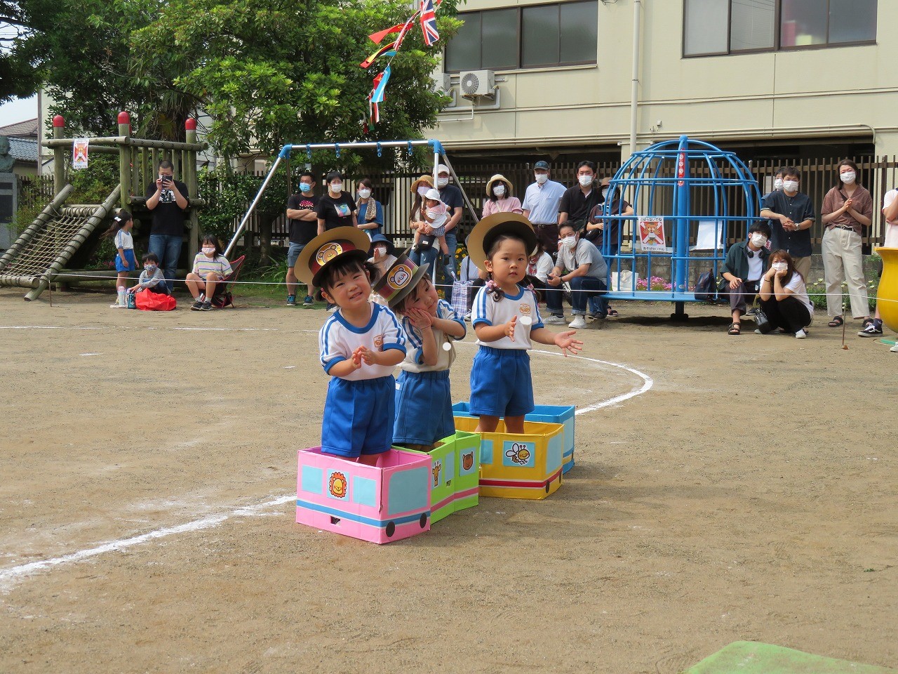 トップバッターはばら組さんともも組さん。ばら組さんは色とりどりの旗をもってビシッとかっこ良く、もも組さんは動物列車の車掌さんになってシュシュポポー可愛く踊れたね♡バルーンや玉入れ、はちさんのおつかいなどなど、楽しい競技がい~ぱいでした!
