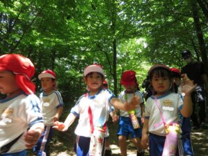 この日は年少組のお友だちがお弁当を持って夢の森公園へお出かけです☀さあ、ここから森の道だ~!「あれあれ?誰の声🐦?🐸?」「分かれ道だよ!どっちの道を行く!?」小さな探検隊はワクワクしながら進みます。暑い日だったので、今日は里山工房をお借りしてお弁当をいただきました。せっかくシートを持ってきたので、土間に敷かせてもらってのランチタイム♪お尻がひんやりして気持ちいいね!楽しくてあっという間の1日でした。帰りのバスの中はとっても静か。気が付けばみ~んなお昼寝…💤