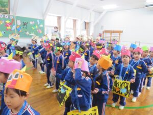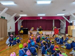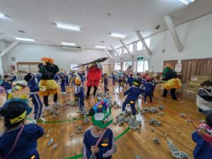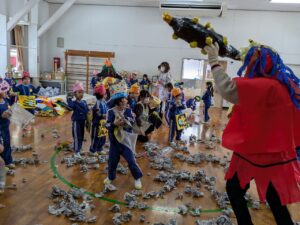 ♪鬼は外~ 福は内~♪ ちょっぴり怖いけれど楽しみにしていた 豆まきをしました。当日は、自分のやっつけたい鬼をお面にし、新聞紙で作った豆を持って集まりました。お面を見せ合いっこしたり歌を歌ったりしていると、どこからともなく不気味な音が…💦鬼の大将を筆頭に、4体もの鬼がやってきました!!小さい子は怖くて先生の後ろに隠れちゃったけれど、みんなで力を合わせて見事!鬼たちを追い払うことができたね✨これでみんなの心から、悪い鬼はいなくなったはず!鬼をやっつけるために勇気を出して立ち向かった強い気持ちを忘れないで、心優しく、そして強い子どもになってね♪