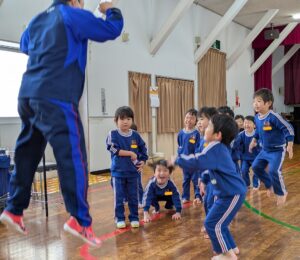 木曜日に行われている特設体育教室。年中・年長さんが参加していますが、この日、年少さんが体験することができました!鬼ごっこをしたり身体を動かしながらゲームをしたり。マット、鉄棒などの運動遊びも楽しみました。4月になれば年中さんになって、もっとたくさん身体を動かしながら楽しく運動遊びができるね!